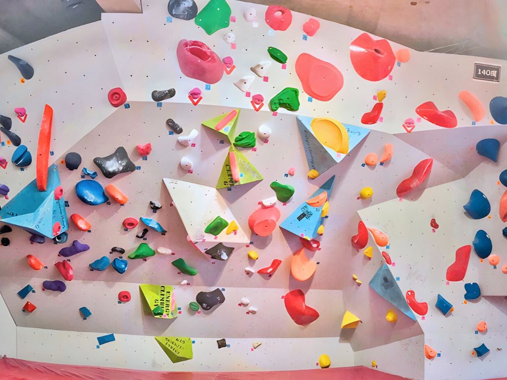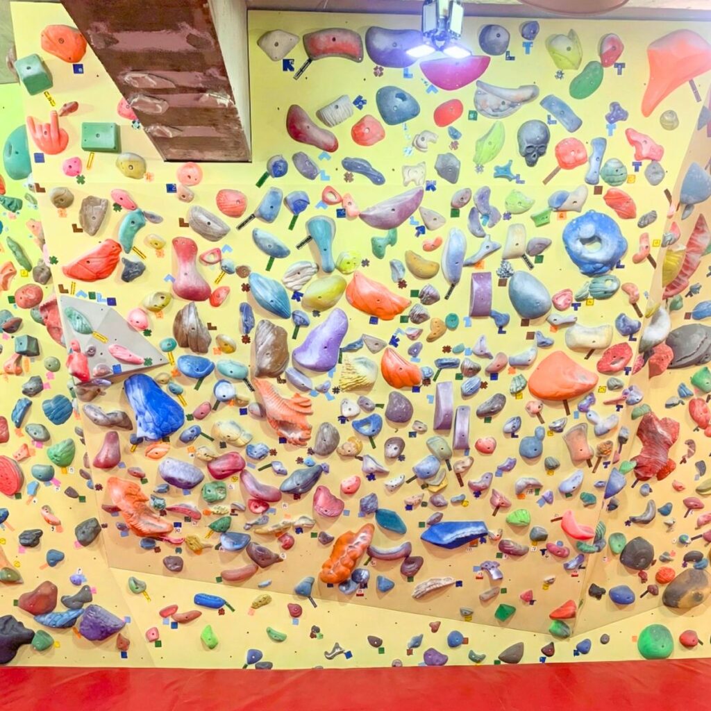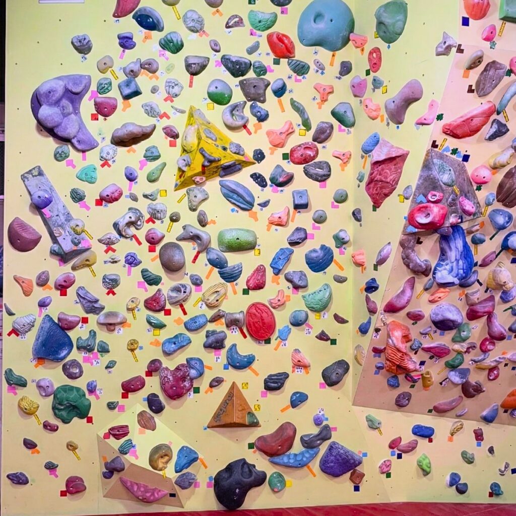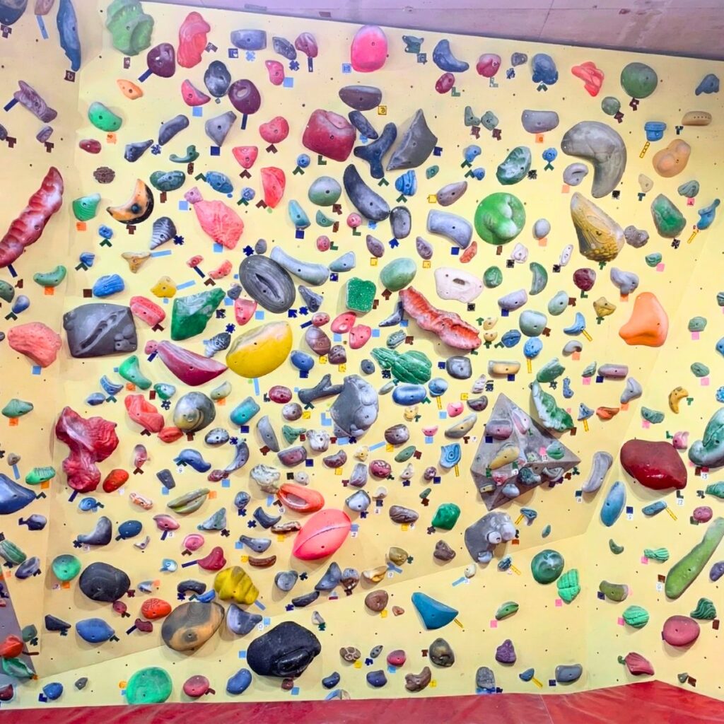 黄色い壁は、ラインセット(同じ色のホールドでセットされた課題)をベースにして、空いたスペースに所狭しとホールドを散りばめてあるエリアです。