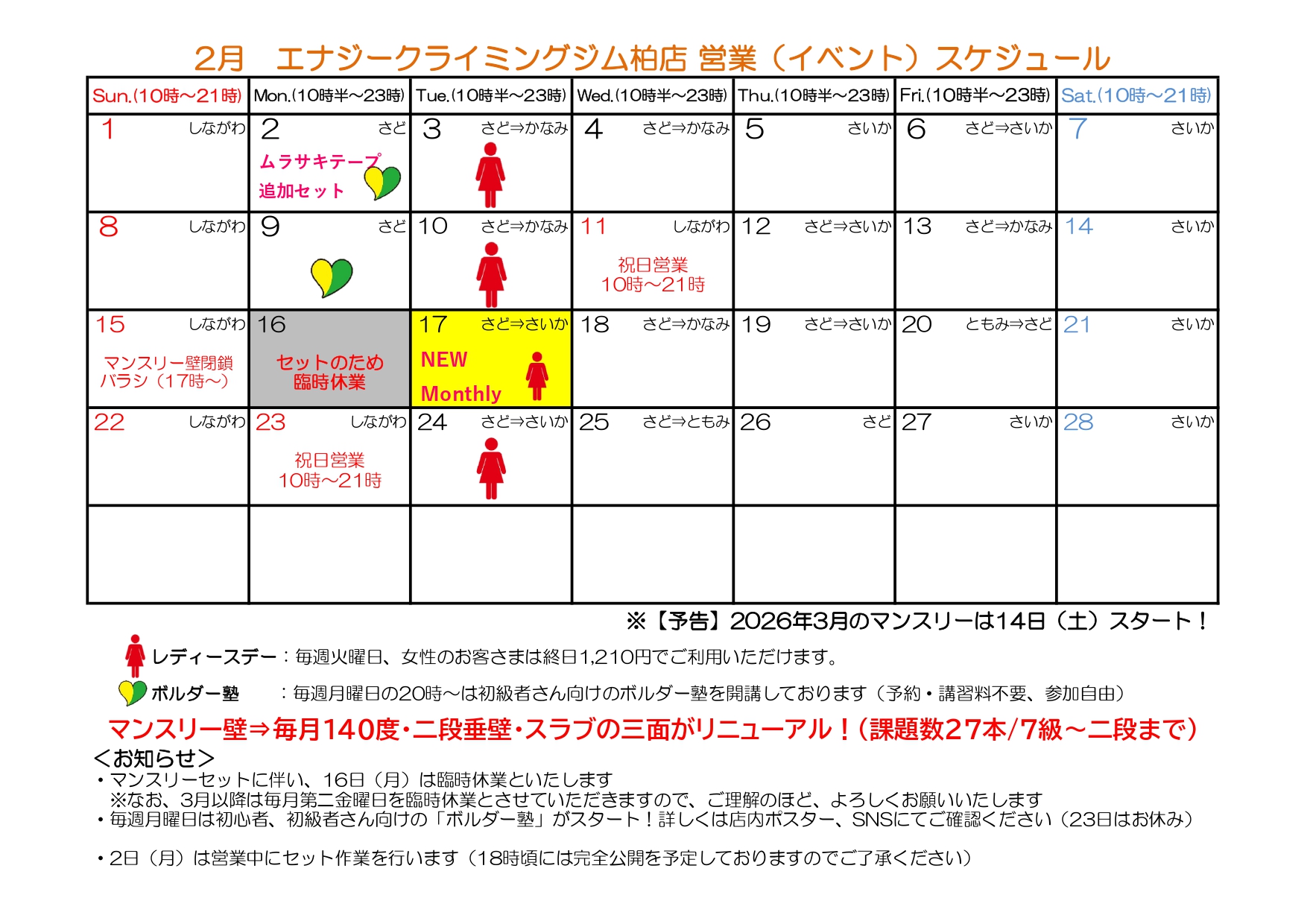 エナジー柏では、二段垂壁/スラブ(基礎・バランス)と、140°(強度・ムーブ構築)の白い壁2面がマンスリーになっています。